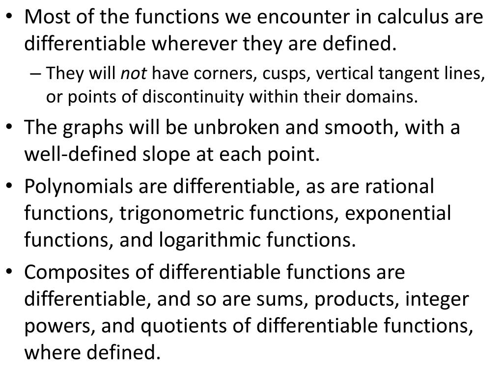 Most of the functions we encounter in calculus are differentiable wherever they are defined. • They will not have corners, cusps, vertical tangent lines, or points of discontinuity within their domains. • The graphs will be unbroken and smooth, with a well-defined slope at each point. • Polynomials are differentiable, as are rational functions, trigonometric functions, exponential functions, and logarithmic functions. • Composites of differentiable functions are differentiable, and so are sums, products, integer powers, and quotients of differentiable functions, where defined.