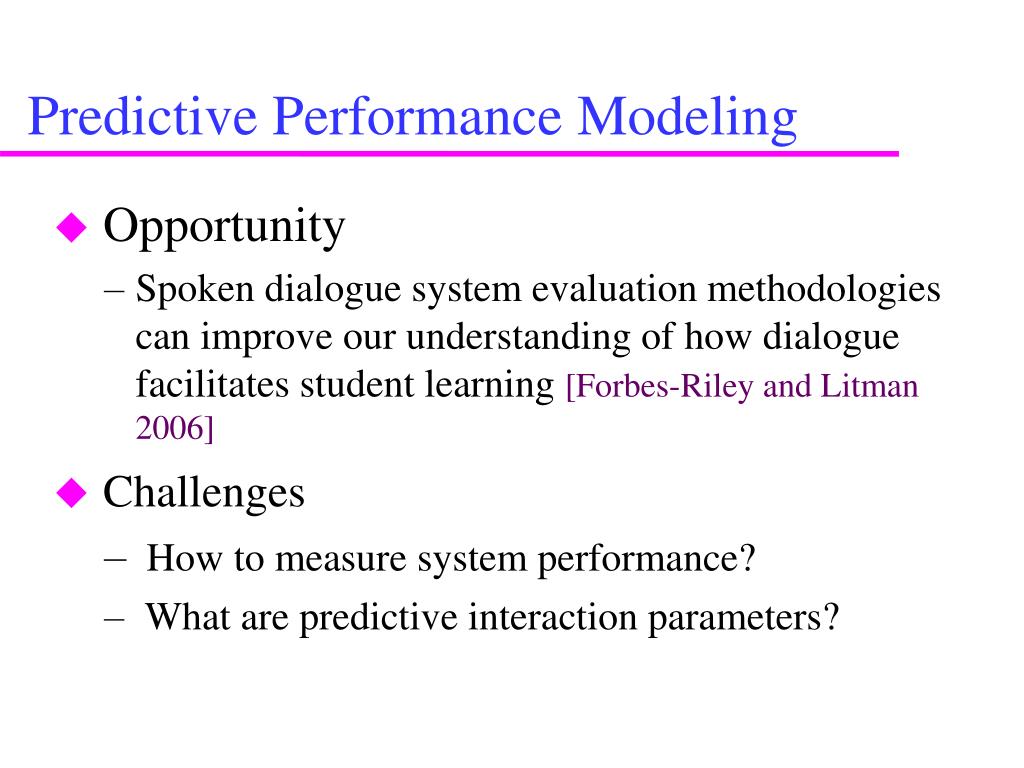 Predictive Performance Modeling • Opportunity • Spoken dialogue system evaluation methodologies can improve our understanding of how dialogue facilitates student learning [Forbes-Riley and Litman 2006] • Challenges • How to measure system performance? • What are predictive interaction parameters?