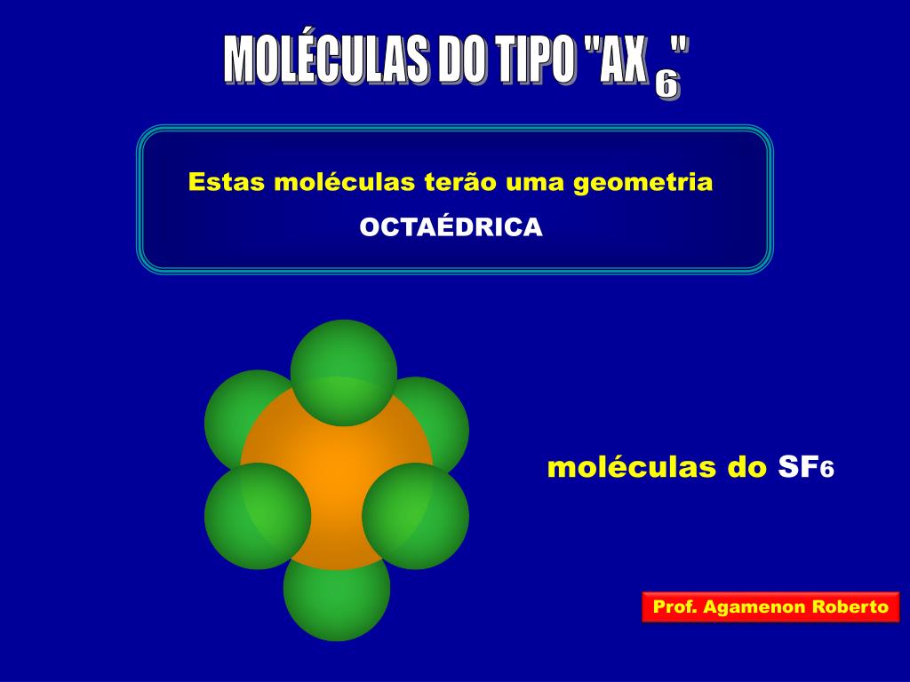 MOLÉCULAS DO TIPO "AX " 6 Estas moléculas terão uma geometria OCTAÉDRICA moléculas do SF6 Prof. Agamenon Roberto
