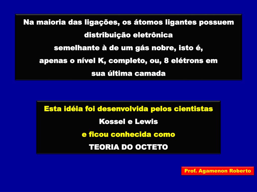 Na maioria das ligações, os átomos ligantes possuem distribuição eletrônica semelhante à de um gás nobre, isto é, apenas o nível K, completo, ou, 8 elétrons em sua última camada Esta idéia foi desenvolvida pelos cientistas Kossel e Lewis e ficou conhecida como TEORIA DO OCTETO Prof. Agamenon Roberto