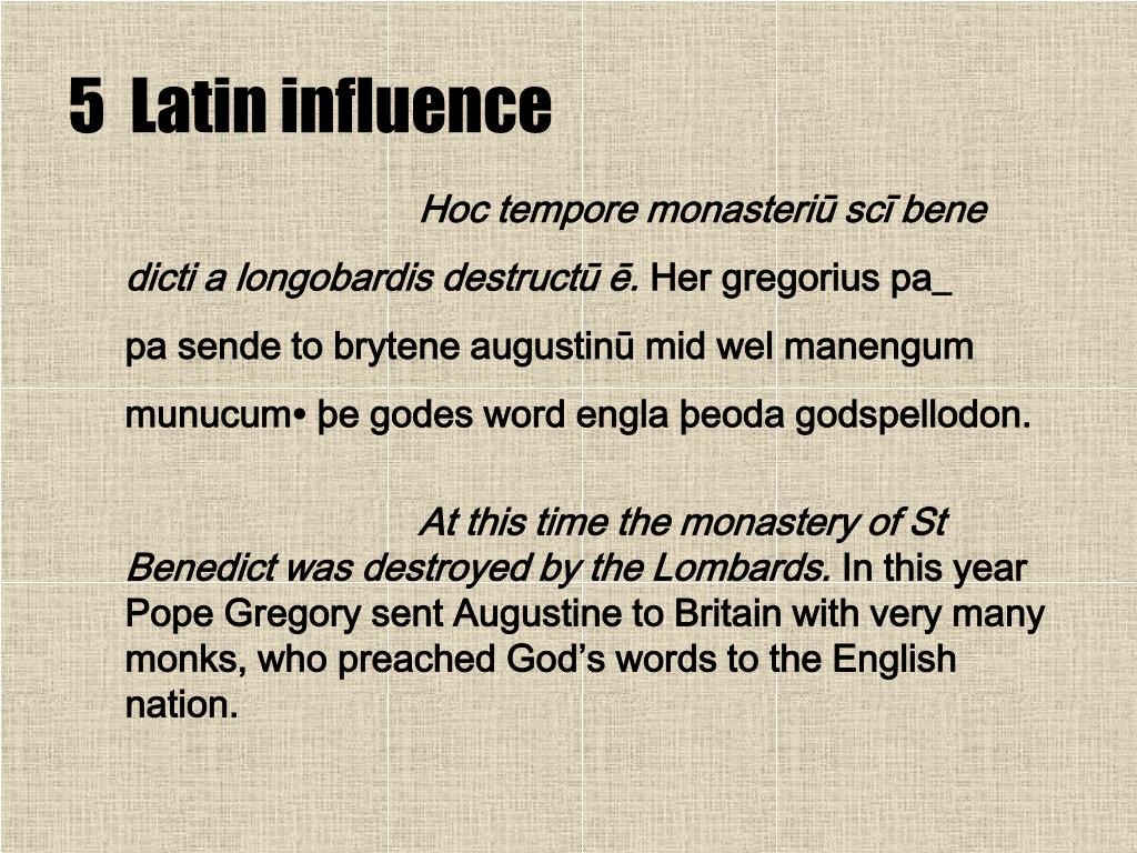 ISTORY OF ENGLISH. LECTURE 3 Old English: language (II). Lei ZHU Shanghai International Studies University. 5 Latin influence. Hoc tempore monasteriū scī bene dicti a longobardis destructū ē. Her gregorius pa_ pa sende to brytene augustinū mid wel manengum