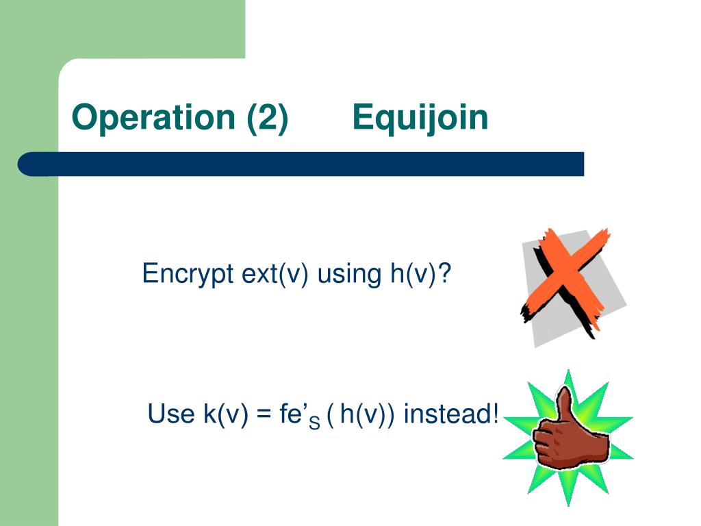 Operation (2) Equijoin Encrypt ext(v) using h(v)? Use k(v) = fe’S (h(v)) instead!