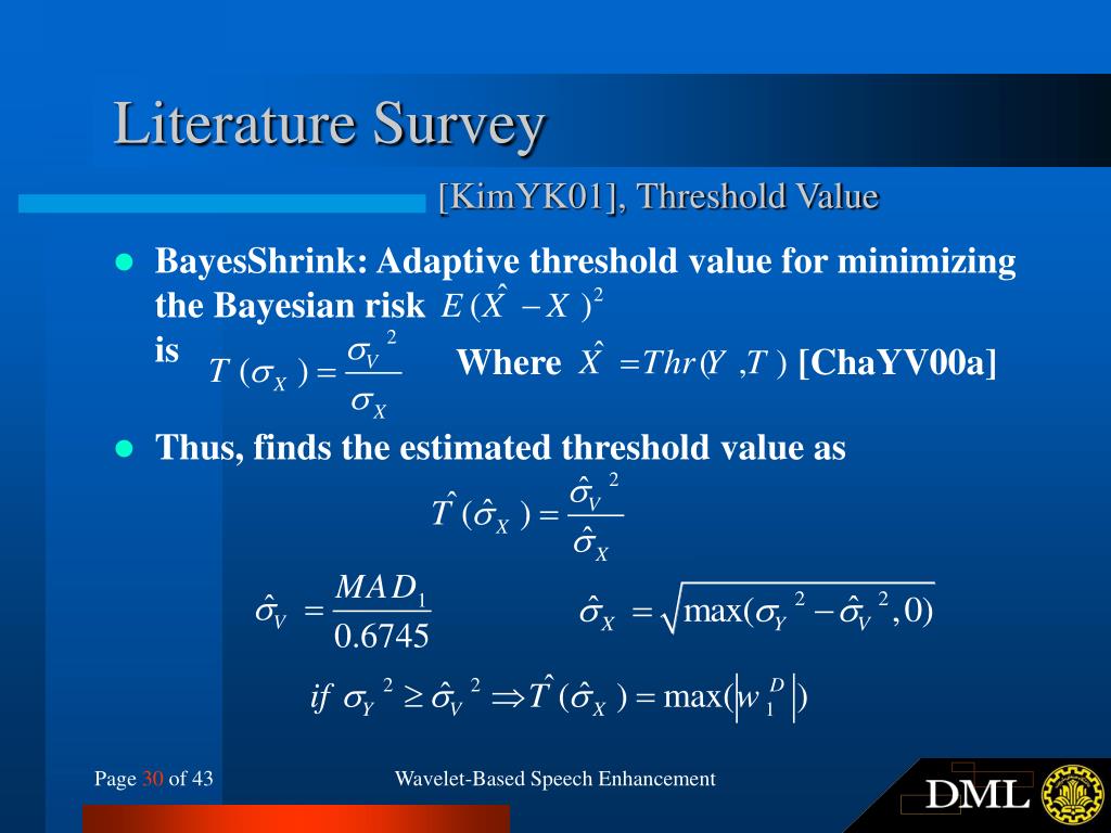 Literature Survey [KimYK01], Threshold Value • BayesShrink: Adaptive threshold value for minimizingthe Bayesian riskis • Thus, finds the estimated threshold value as Where [ChaYV00a] Wavelet-Based Speech Enhancement