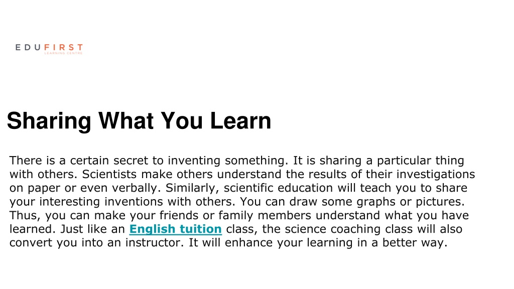 4. Sharing What You Learn There is a certain secret to inventing something. It is sharing a particular thing with others. Scientists make others understand the results of their investigations on paper or even verbally. Similarly, scientific education will teach you to share your interesting inventions with others. You can draw some graphs or pictures. Thus, you can make your friends or family members understand what you have learned. Just like an English tuition class, the science coaching class will also convert you into an instructor. It will enhance your learning in a better way.