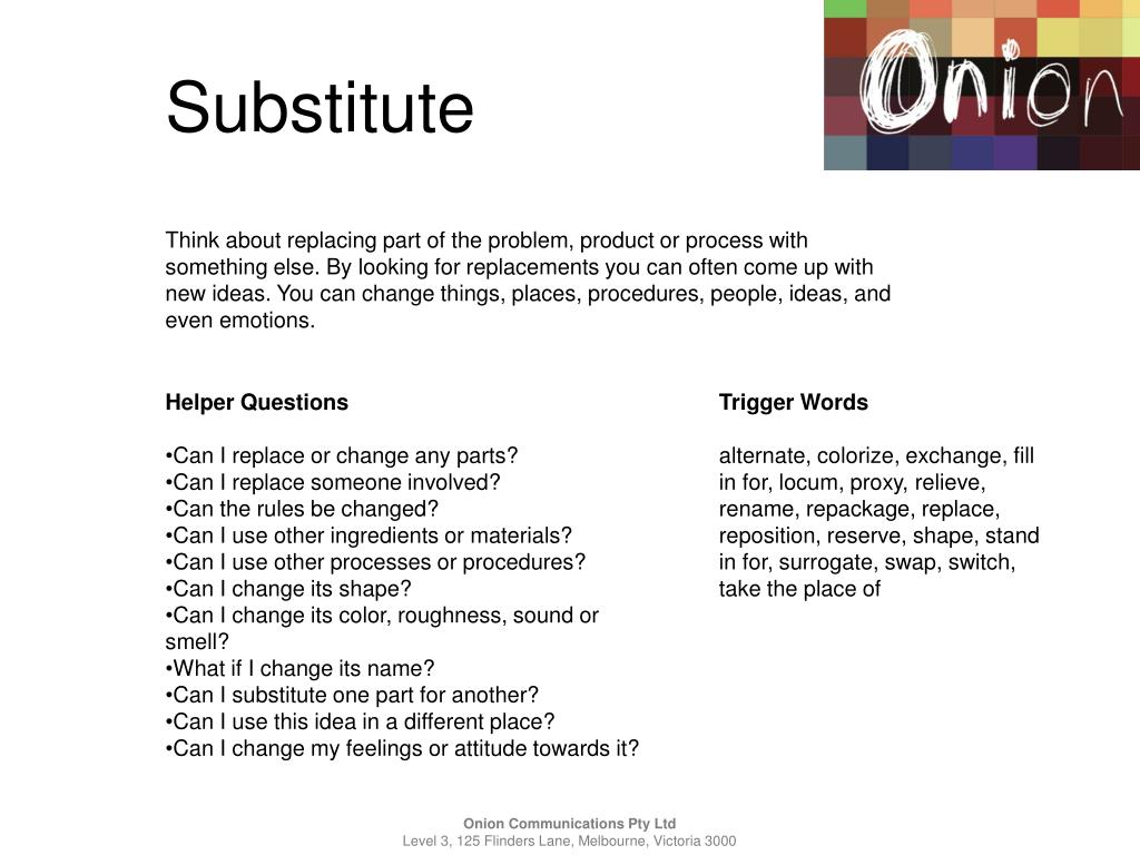 Substitute Think about replacing part of the problem, product or process with something else. By looking for replacements you can often come up with new ideas. You can change things, places, procedures, people, ideas, and even emotions. • Helper Questions • Can I replace or change any parts? • Can I replace someone involved? • Can the rules be changed? • Can I use other ingredients or materials? • Can I use other processes or procedures? • Can I change its shape? • Can I change its color, roughness, sound or smell? • What if I change its name? • Can I substitute one part for another? • Can I use this idea in a different place? • Can I change my feelings or attitude towards it? Trigger Words alternate, colorize, exchange, fill in for, locum, proxy, relieve, rename, repackage, replace, reposition, reserve, shape, stand in for, surrogate, swap, switch, take the place of