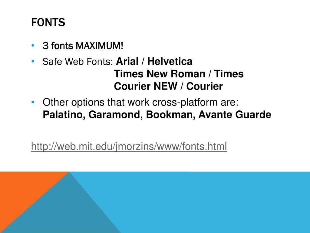 fonts • 3 fonts MAXIMUM! • Safe Web Fonts: Arial / Helvetica Times New Roman / Times Courier NEW / Courier • Other options that work cross-platform are: Palatino, Garamond, Bookman, AvanteGuarde • http://web.mit.edu/jmorzins/www/fonts.html