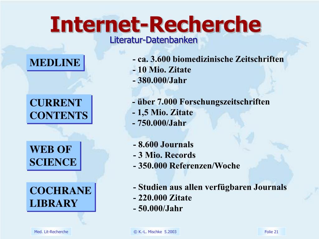 Internet-Recherche Literatur-Datenbanken CURRENT CONTENTS - über 7.000 Forschungszeitschriften - 1,5 Mio. Zitate - 750.000/Jahr - 8.600 Journals - 3 Mio. Records - 350.000 Referenzen/Woche WEB OF SCIENCE - Studien aus allen verfügbaren Journals - 220.000 Zitate - 50.000/Jahr COCHRANE LIBRARY - ca. 3.600 biomedizinische Zeitschriften - 10 Mio. Zitate - 380.000/Jahr MEDLINE