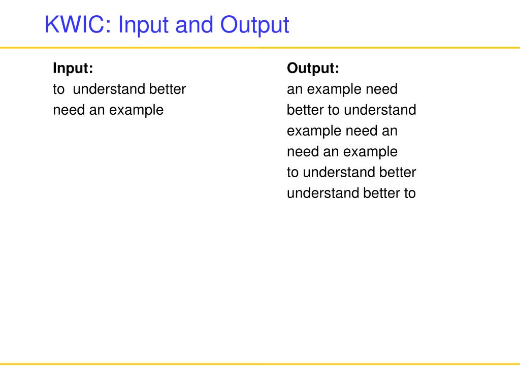 KWIC: Input and Output Input:Output: to understand better an example need need an example better to understand example need an need an example to understand better understand better to