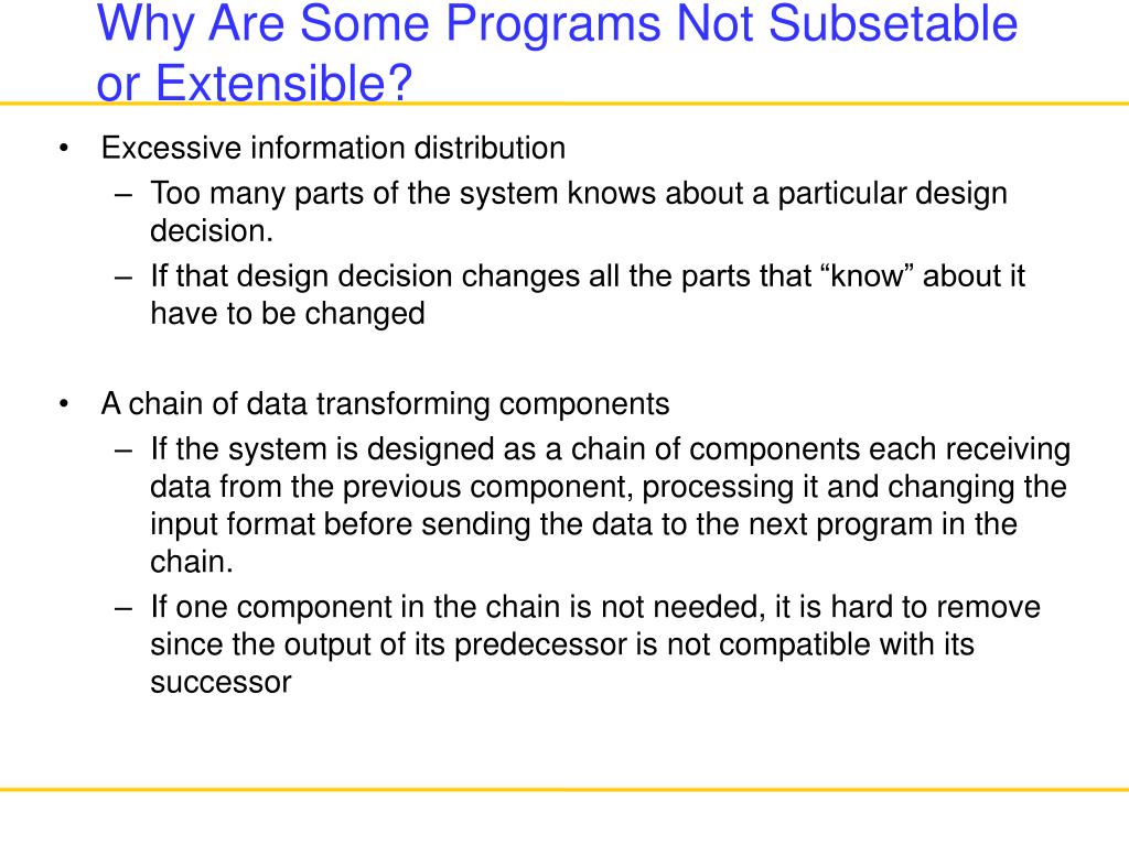 Why Are Some Programs Not Subsetable or Extensible? • Excessive information distribution • Too many parts of the system knows about a particular design decision. • If that design decision changes all the parts that “know” about it have to be changed • A chain of data transforming components • If the system is designed as a chain of components each receiving data from the previous component, processing it and changing the input format before sending the data to the next program in the chain. • If one component in the chain is not needed, it is hard to remove since the output of its predecessor is not compatible with its successor