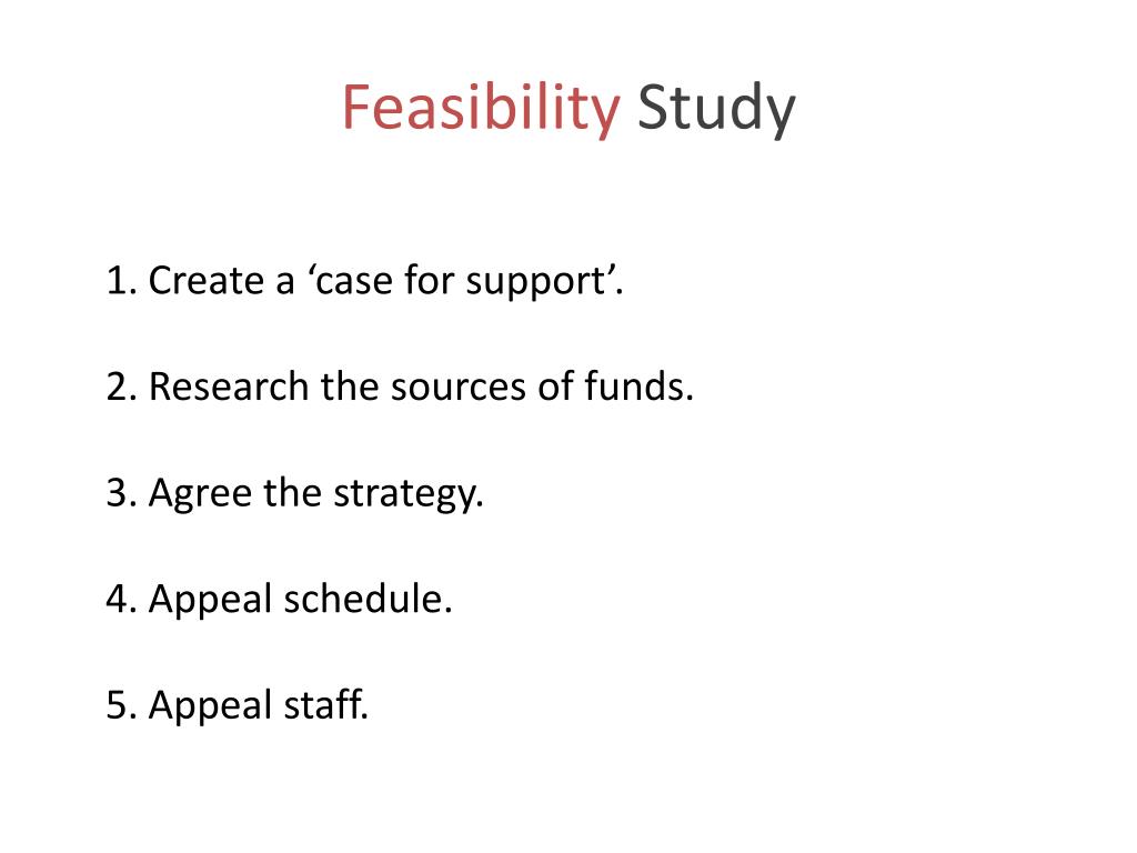 Feasibility Study • Create a ‘case for support’. • Research the sources of funds. • Agree the strategy. • Appeal schedule. • Appeal staff.