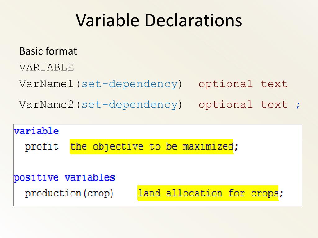 Variable Declarations Basic format VARIABLE VarName1(set-dependency)optional text VarName2(set-dependency)optional text ;