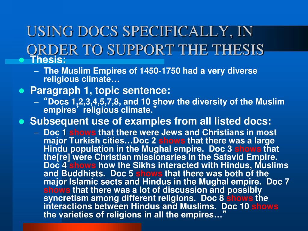 MUSLIM EMPIRES DBQ. EXAMPLES OF HIGH-QUALITY THESIS STATEMENTS, POV, ADDT ’ L DOC REQUESTS, AND TOPIC SENTENCES…. GOOD THESIS. “ While the overall political and religious climates of the Muslim Empires in 1450-1750 were tense, religious tolerance can be seen in the Mughal and Ottoman Empires. ”.