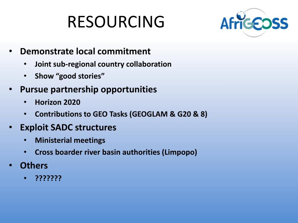 RESOURCING Demonstrate local commitment Joint sub-regional country collaboration Show “good stories” Pursue partnership opportunities Horizon 2020 Contributions to GEO Tasks (GEOGLAM & G20 & 8) Exploit SADC structures Ministerial meetings Cross boarder river basin authorities (Limpopo) Others ???????