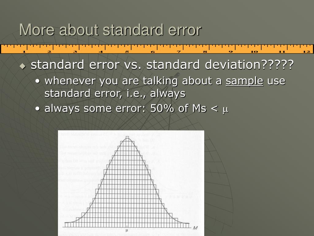 More about standard error • standard error vs. standard deviation????? • whenever you are talking about a sample use standard error, i.e., always • always some error: 50% of Ms <