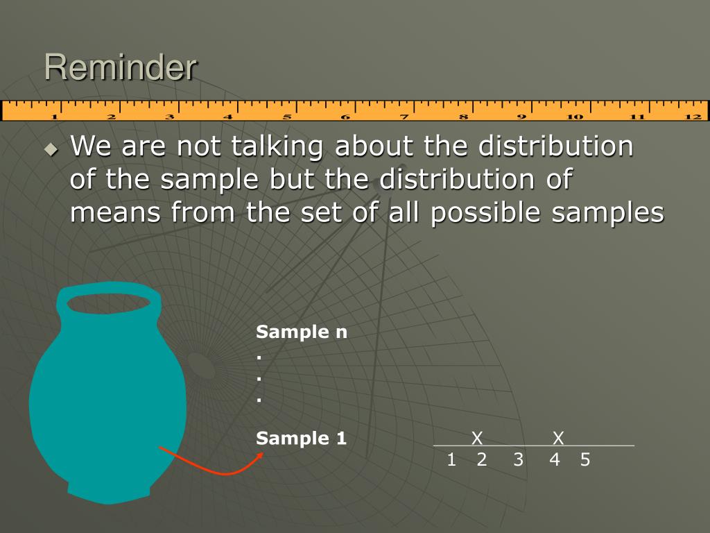 Reminder • We are not talking about the distribution of the sample but the distribution of means from the set of all possible samples Sample n... Sample 1 X X 1 2 3 4 5