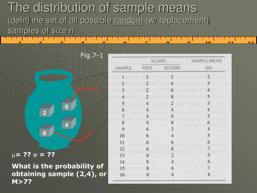 The distribution of sample means(defn) the set of all possible random (w/ replacement) samples of size n Fig.7-1 6 2 4 8 • = ?? = ?? What is the probability of obtaining sample (2,4), or M>7?
