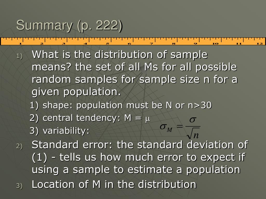 Summary (p. 222) • What is the distribution of sample means? the set of all Ms for all possible random samples for sample size n for a given population. • shape: population must be N or n>30 • central tendency: M = • variability: • Standard error: the standard deviation of (1) - tells us how much error to expect if using a sample to estimate a population • Location of M in the distribution