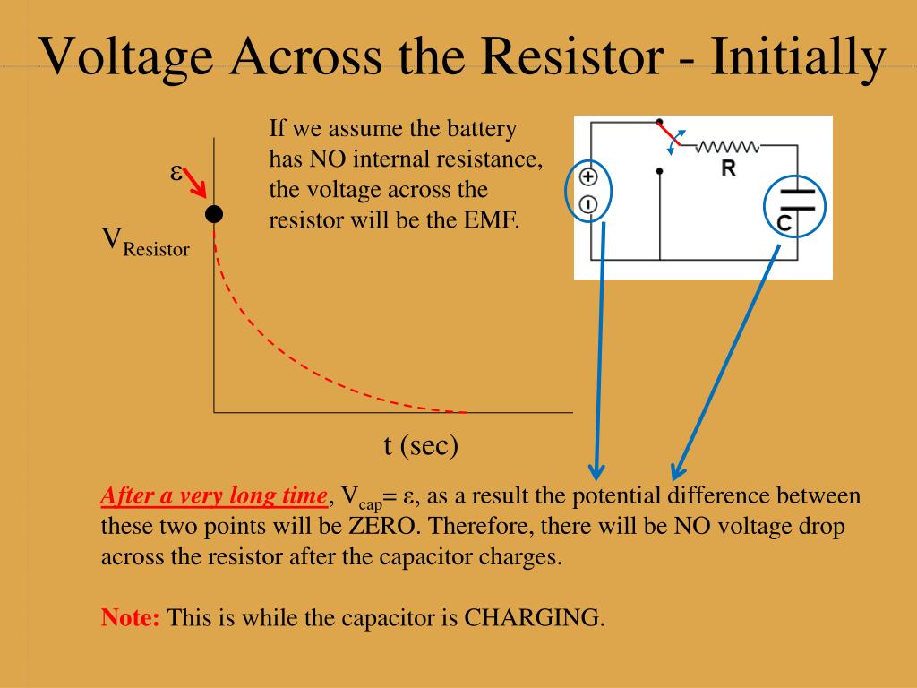 Voltage Across the Resistor - Initially If we assume the battery has NO internal resistance, the voltage across the resistor will be the EMF. e VResistor t (sec) After a very long time, Vcap= e, as a result the potential difference between these two points will be ZERO. Therefore, there will be NO voltage drop across the resistor after the capacitor charges. Note: This is while the capacitor is CHARGING.