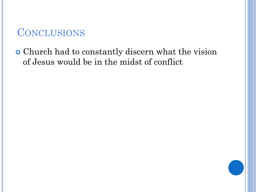 Conclusions • Church had to constantly discern what the vision of Jesus would be in the midst of conflict
