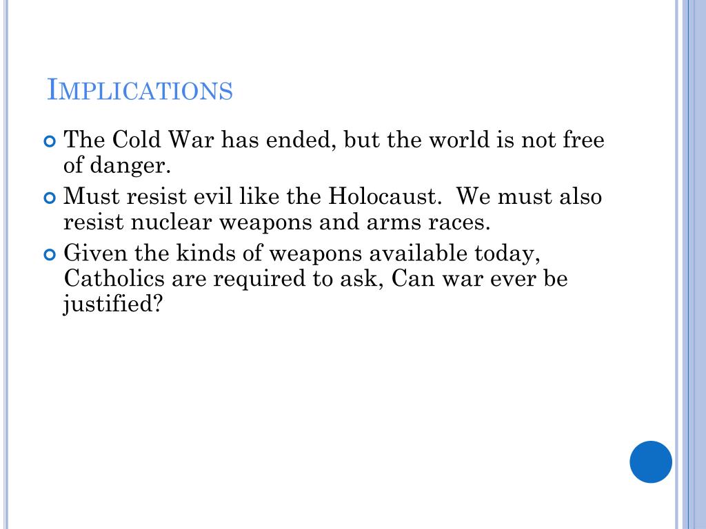 Implications • The Cold War has ended, but the world is not free of danger. • Must resist evil like the Holocaust. We must also resist nuclear weapons and arms races. • Given the kinds of weapons available today, Catholics are required to ask, Can war ever be justified?