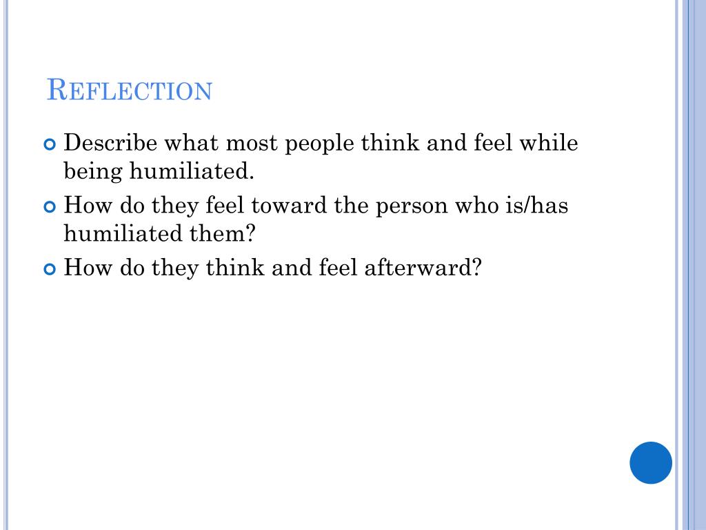 Reflection • Describe what most people think and feel while being humiliated. • How do they feel toward the person who is/has humiliated them? • How do they think and feel afterward?