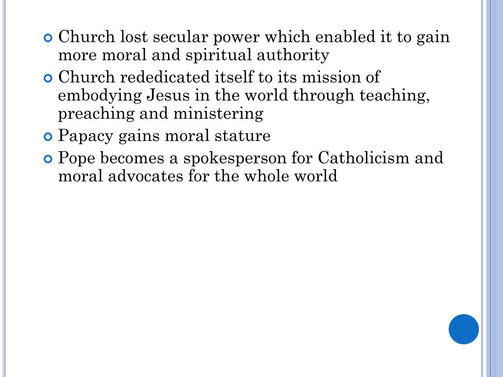 Church lost secular power which enabled it to gain more moral and spiritual authority • Church rededicated itself to its mission of embodying Jesus in the world through teaching, preaching and ministering • Papacy gains moral stature • Pope becomes a spokesperson for Catholicism and moral advocates for the whole world