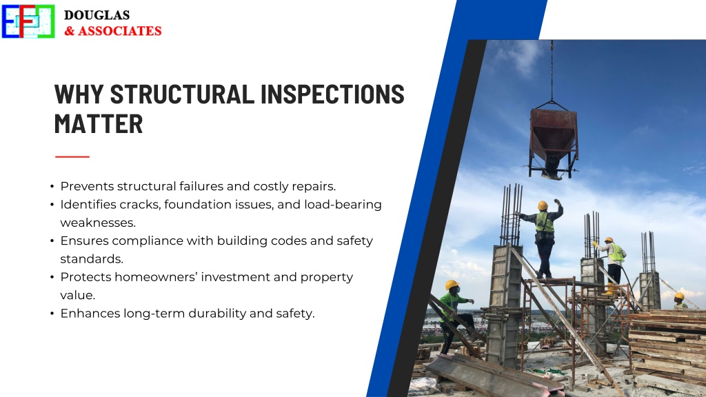 STRUCTURAL INSPECTION SERVICES FOR RESIDENTIAL PROJECTS: ENSURING SAFETY AND LONGEVITY • Structural inspection is the process of evaluating a building’s structural integrity. • It ensures that residential properties are safe, stable, and durable. • Inspections help detect hidden structural issues before they become major problems. • Essential for new constructions, renovations, and older homes. www.efdouglasandassociates.com
