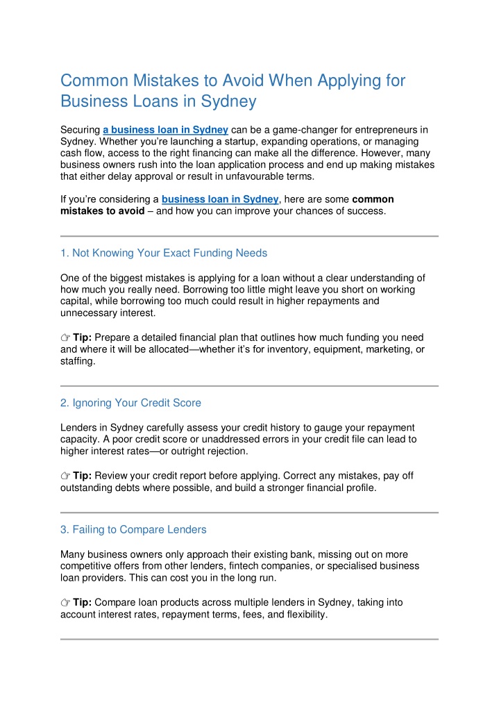Securing a business loan in Sydney can be a game-changer for entrepreneurs in Sydney. Whether youu2019re launching a startup, expanding operations, or managing cash flow, access to the right financing can make all the difference. However, many business owners rush into the loan application process and end up making mistakes that either delay approval or result in unfavourable terms.