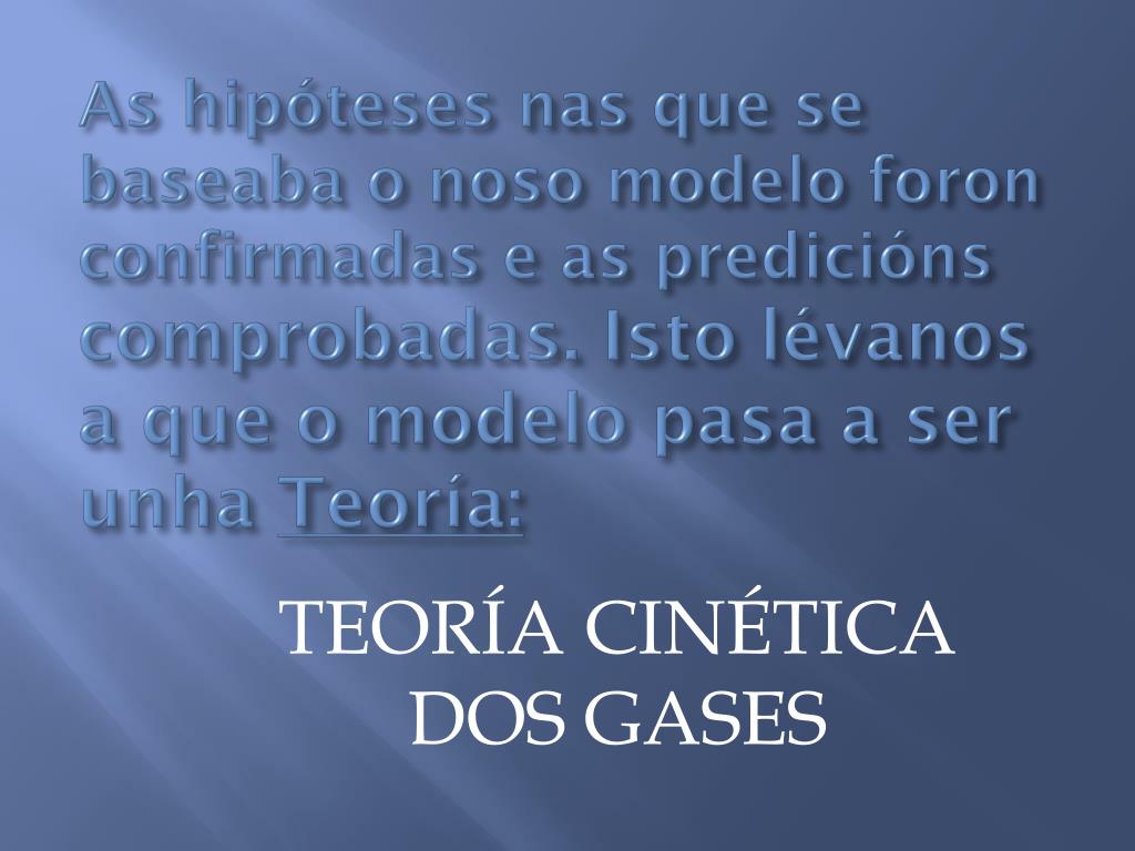 As hipóteses nas que se baseaba o noso modelo foron confirmadas e as predicións comprobadas. Isto lévanos a que o modelo pasa a ser unha Teoría: TEORÍA CINÉTICA DOS GASES
