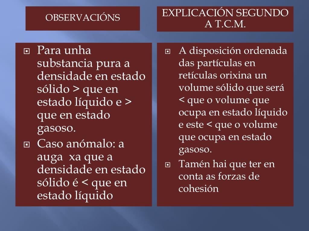 OBSERVACIÓNS EXPLICACIÓN SEGUNDO A T.C.M. • Para unha substancia pura a densidade en estado sólido > que en estado líquido e > que en estado gasoso. • Caso anómalo: a auga xa que a densidade en estado sólido é < que en estado líquido • A disposición ordenada das partículas en retículas orixina un volume sólido que será < que o volume que ocupa en estado líquido e este < que o volume que ocupa en estado gasoso. • Tamén hai que ter en conta as forzas de cohesión