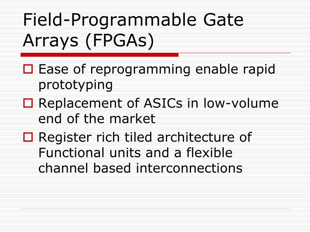 Field-Programmable Gate Arrays (FPGAs) • Ease of reprogramming enable rapid prototyping • Replacement of ASICs in low-volume end of the market • Register rich tiled architecture of Functional units and a flexible channel based interconnections