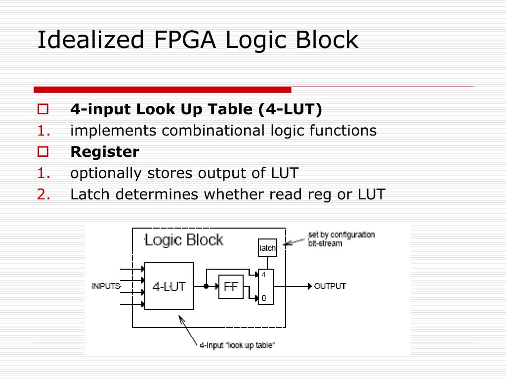 Idealized FPGA Logic Block • 4-input Look Up Table (4-LUT) • implements combinational logic functions • Register • optionally stores output of LUT • Latch determines whether read reg or LUT