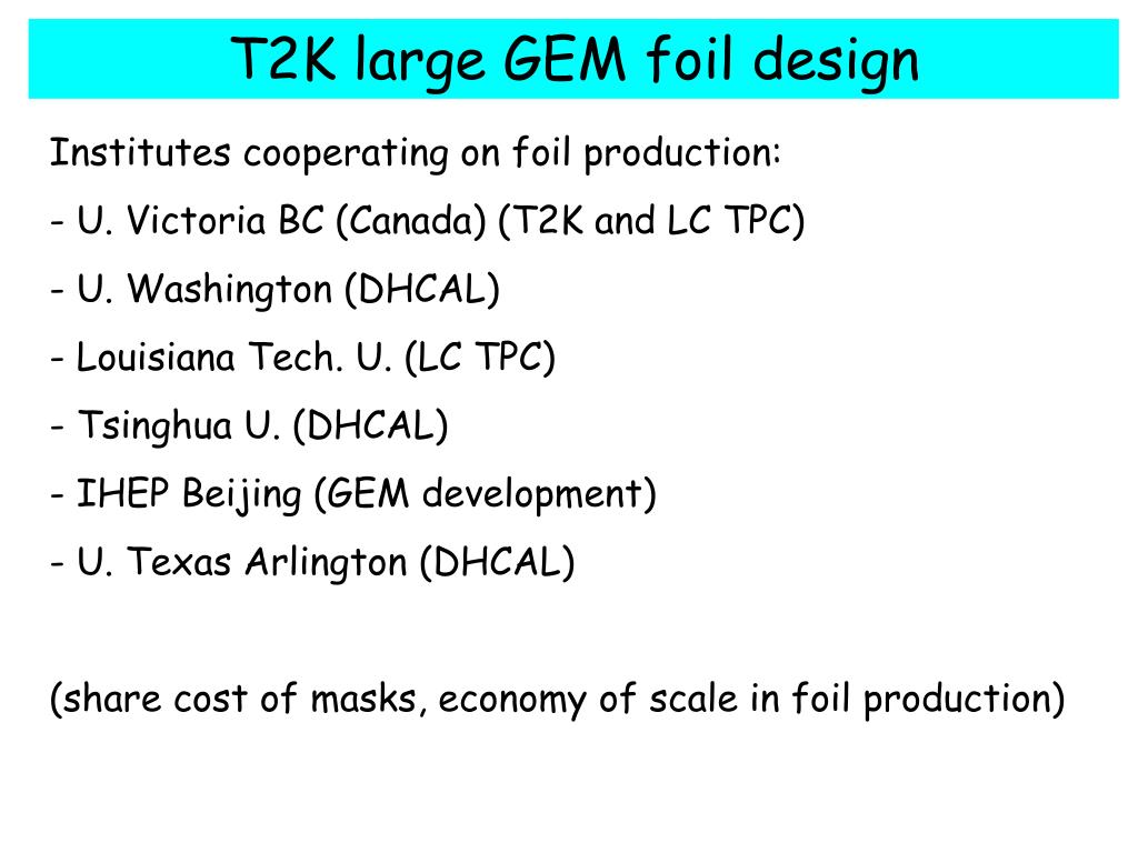 T2K large GEM foil design • Institutes cooperating on foil production: • U. Victoria BC (Canada) (T2K and LC TPC) • U. Washington (DHCAL) • Louisiana Tech. U. (LC TPC) • Tsinghua U. (DHCAL) • IHEP Beijing (GEM development) • U. Texas Arlington (DHCAL) • (share cost of masks, economy of scale in foil production)