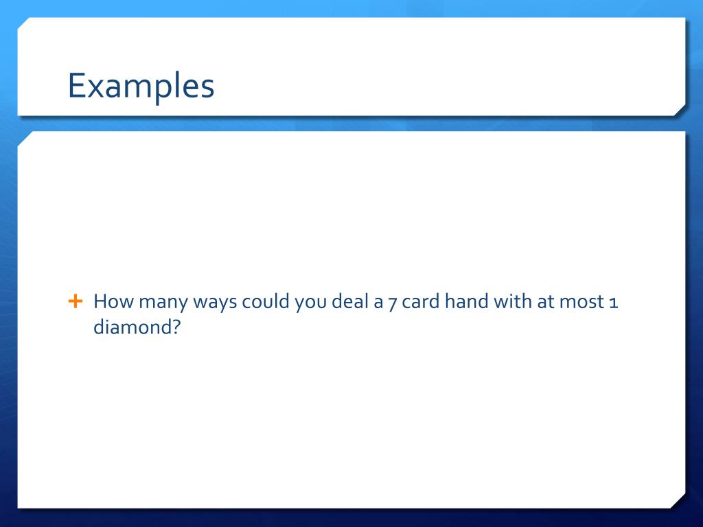 Examples • How many ways could you deal a 7 card hand with at most 1 diamond?