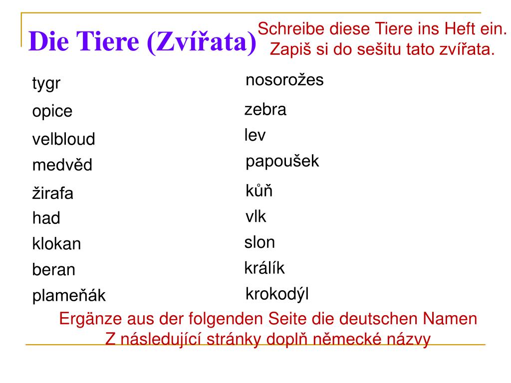 SchreibedieseTiereinsHeft ein. Zapiš si do sešitu tato zvířata. Die Tiere (Zvířata) nosorožes tygr zebra opice lev velbloud papoušek medvěd kůň žirafa vlk had slon klokan králík beran krokodýl plameňák Ergänzeaus der folgendenSeitediedeutschenNamen Z následující stránky doplň německé názvy