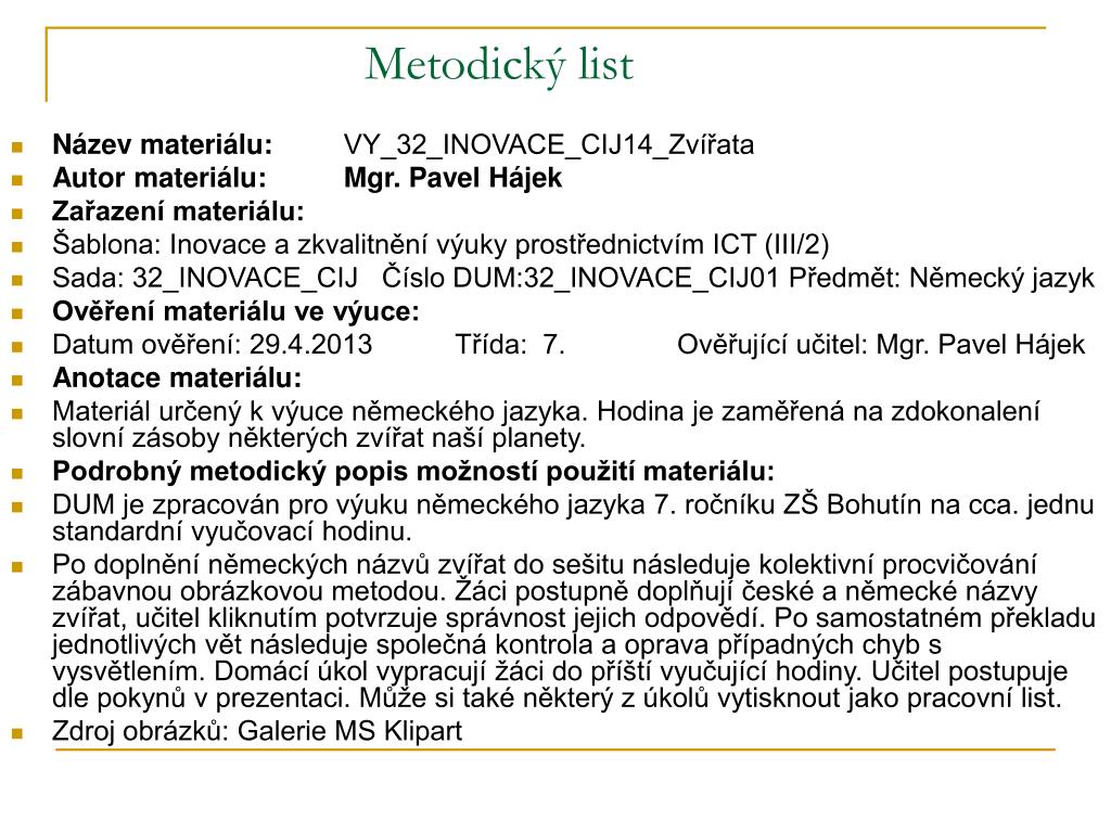 Metodický list • Název materiálu: VY_32_INOVACE_CIJ14_Zvířata • Autor materiálu: Mgr. Pavel Hájek • Zařazení materiálu: • Šablona: Inovace a zkvalitnění výuky prostřednictvím ICT (III/2) • Sada: 32_INOVACE_CIJ Číslo DUM:32_INOVACE_CIJ01 Předmět: Německý jazyk • Ověření materiálu ve výuce: • Datum ověření: 29.4.2013 Třída: 7. Ověřující učitel: Mgr. Pavel Hájek • Anotace materiálu: • Materiál určený k výuce německého jazyka. Hodina je zaměřená na zdokonalení slovní zásoby některých zvířat naší planety. • Podrobný metodický popis možností použití materiálu: • DUM je zpracován pro výuku německého jazyka 7. ročníku ZŠ Bohutín na cca. jednu standardní vyučovací hodinu. • Po doplnění německých názvů zvířat do sešitu následuje kolektivní procvičování zábavnou obrázkovou metodou. Žáci postupně doplňují české a německé názvy zvířat, učitel kliknutím potvrzuje správnost jejich odpovědí. Po samostatném překladu jednotlivých vět následuje společná kontrola a oprava případných chyb s vysvětlením. Domácí úkol vypracují žáci do příští vyučující hodiny. Učitel postupuje dle pokynů v prezentaci. Může si také některý z úkolů vytisknout jako pracovní list. • Zdroj obrázků: Galerie MS Klipart