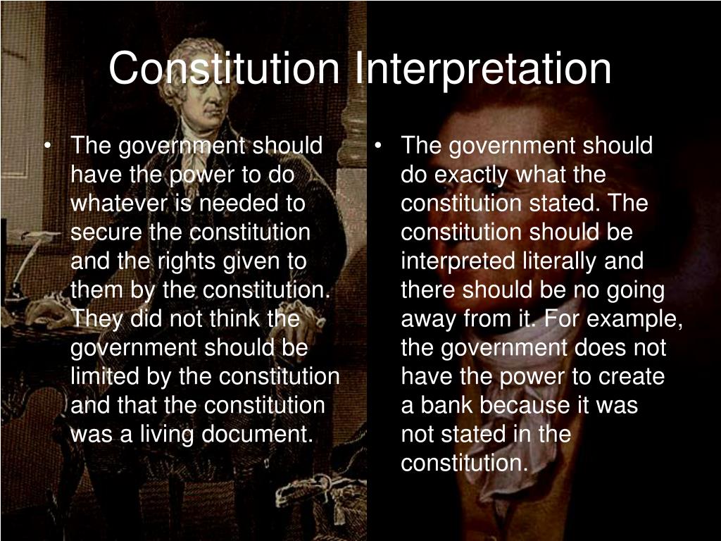 The government should have the power to do whatever is needed to secure the constitution and the rights given to them by the constitution. They did not think the government should be limited by the constitution and that the constitution was a living document. The government should do exactly what the constitution stated. The constitution should be interpreted literally and there should be no going away from it. For example, the government does not have the power to create a bank because it was not stated in the constitution. Constitution Interpretation