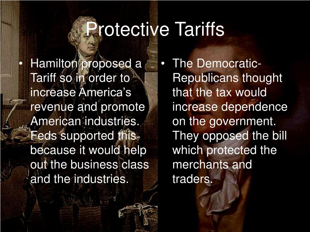 Hamilton proposed a Tariff so in order to increase America’s revenue and promote American industries. Feds supported this because it would help out the business class and the industries. The Democratic-Republicans thought that the tax would increase dependence on the government. They opposed the bill which protected the merchants and traders. Protective Tariffs