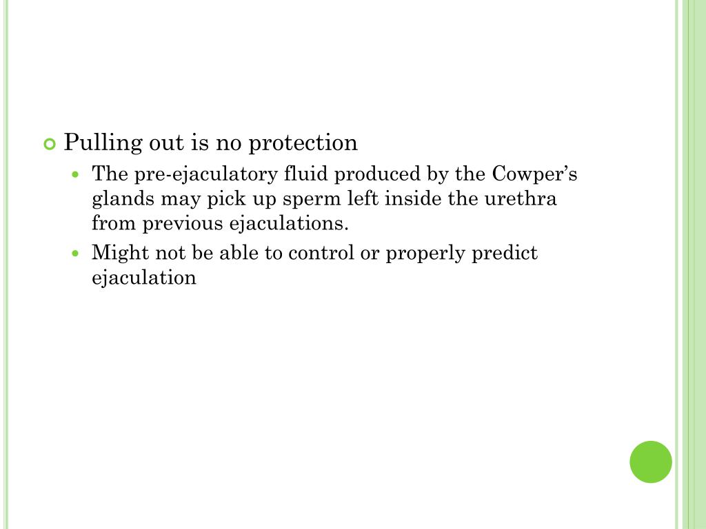 Pulling out is no protection • The pre-ejaculatory fluid produced by the Cowper’s glands may pick up sperm left inside the urethra from previous ejaculations. • Might not be able to control or properly predict ejaculation