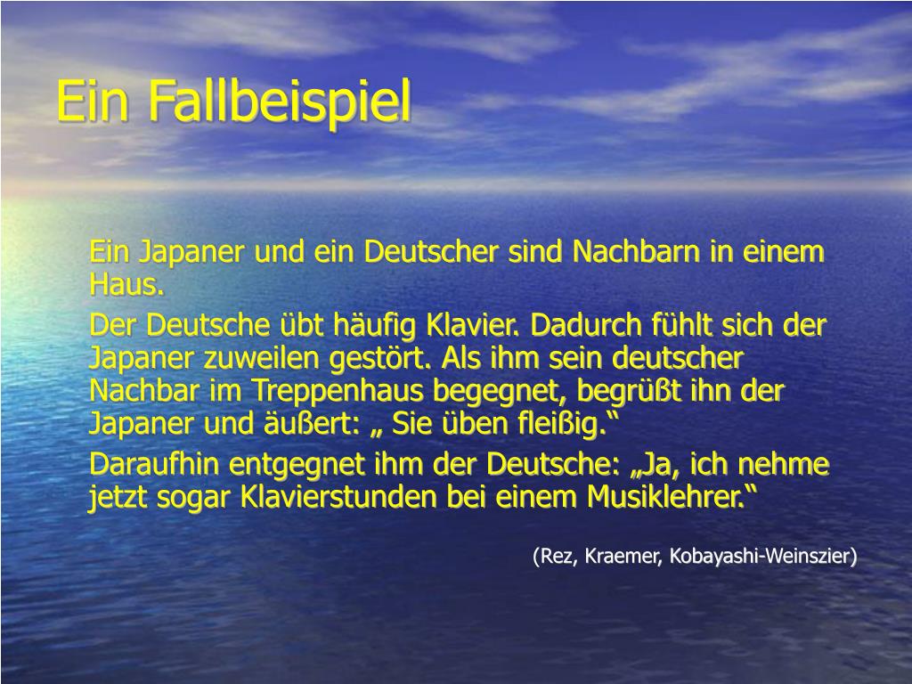Ein Fallbeispiel Ein Japaner und ein Deutscher sind Nachbarn in einem Haus. Der Deutsche übt häufig Klavier. Dadurch fühlt sich der Japaner zuweilen gestört. Als ihm sein deutscher Nachbar im Treppenhaus begegnet, begrüßt ihn der Japaner und äußert: „ Sie üben fleißig.“ Daraufhin entgegnet ihm der Deutsche: „Ja, ich nehme jetzt sogar Klavierstunden bei einem Musiklehrer.“ (Rez, Kraemer, Kobayashi-Weinszier)