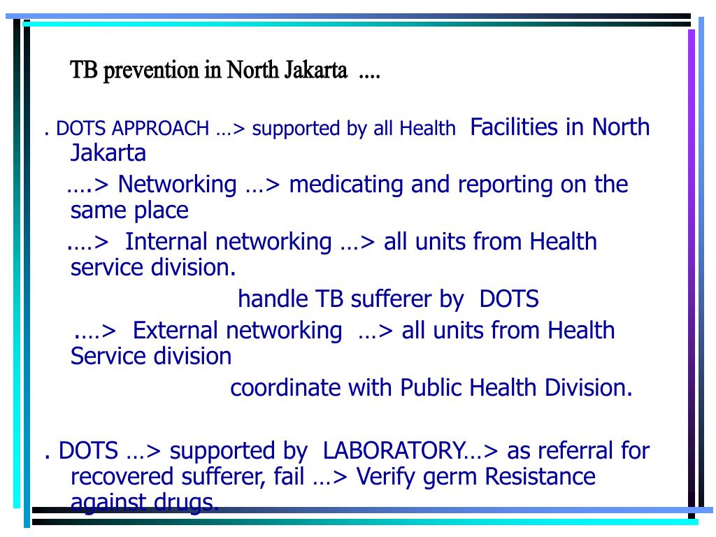 TB prevention in North Jakarta .... . DOTS APPROACH …> supported by all Health Facilities in North Jakarta ….> Networking …> medicating and reporting on the same place .…> Internal networking …> all units from Health service division. handle TB sufferer by DOTS .…> External networking …> all units from Health Service division coordinate with Public Health Division. . DOTS …> supported by LABORATORY…> as referral for recovered sufferer, fail …> Verify germ Resistance against drugs.