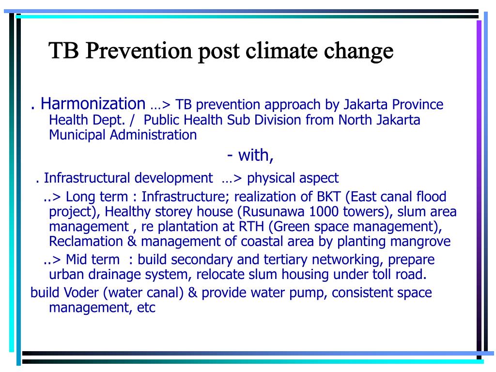 TB Prevention post climate change . Harmonization …> TB prevention approach by Jakarta Province Health Dept. / Public Health Sub Division from North Jakarta Municipal Administration - with, . Infrastructural development …> physical aspect ..> Long term : Infrastructure; realization of BKT (East canal flood project), Healthy storey house (Rusunawa 1000 towers), slum area management , re plantation at RTH (Green space management), Reclamation & management of coastal area by planting mangrove ..> Mid term : build secondary and tertiary networking, prepare urban drainage system, relocate slum housing under toll road. build Voder (water canal) & provide water pump, consistent space management, etc