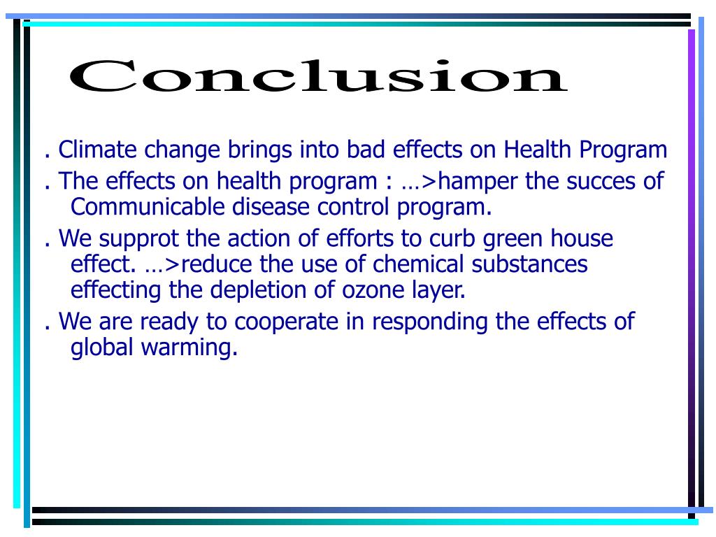 Conclusion . Climate change brings into bad effects on Health Program . The effects on health program : …>hamper the succes of Communicable disease control program. . We supprot the action of efforts to curb green house effect. …>reduce the use of chemical substances effecting the depletion of ozone layer. . We are ready to cooperate in responding the effects of global warming.