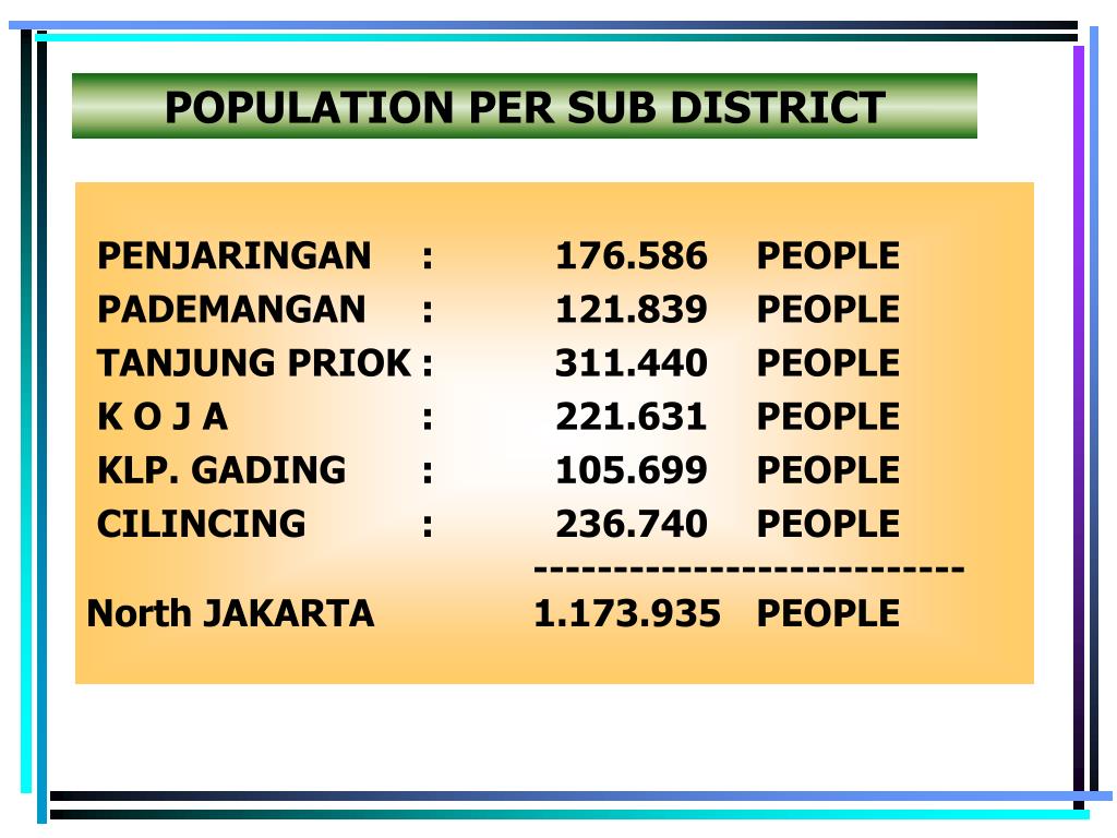 POPULATION PER SUB DISTRICT PENJARINGAN : 176.586 PEOPLE PADEMANGAN : 121.839 PEOPLE TANJUNG PRIOK : 311.440 PEOPLE K O J A : 221.631 PEOPLE KLP. GADING : 105.699 PEOPLE CILINCING : 236.740 PEOPLE --------------------------- North JAKARTA 1.173.935 PEOPLE
