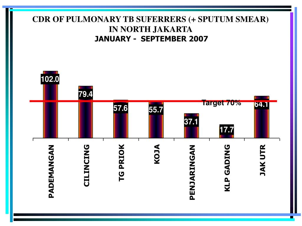 CDR OF PULMONARY TB SUFERRERS (+ SPUTUM SMEAR) IN NORTH JAKARTA JANUARY - SEPTEMBER 2007 Target 70%