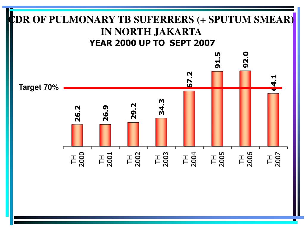 CDR OF PULMONARY TB SUFERRERS (+ SPUTUM SMEAR) IN NORTH JAKARTA YEAR 2000 UP TO SEPT 2007 Target 70%