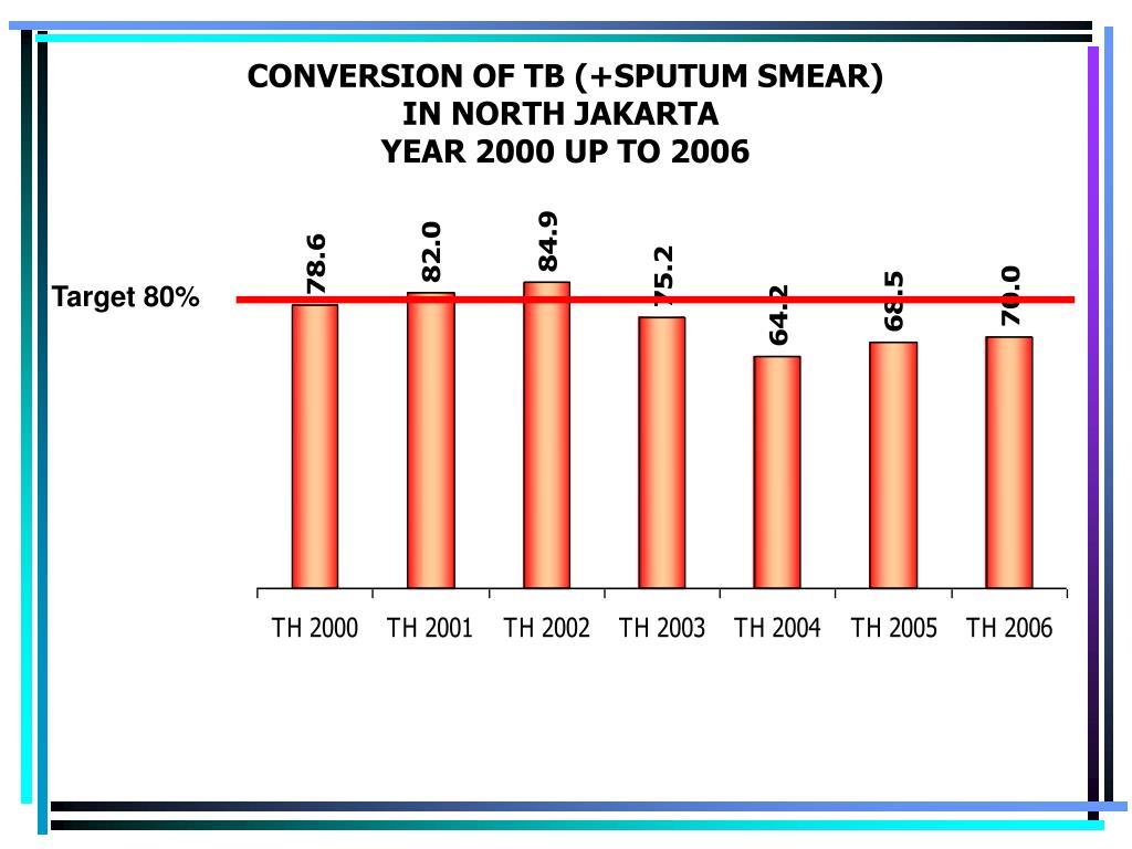 CONVERSION OF TB (+SPUTUM SMEAR) IN NORTH JAKARTA YEAR 2000 UP TO 2006 Target 80%