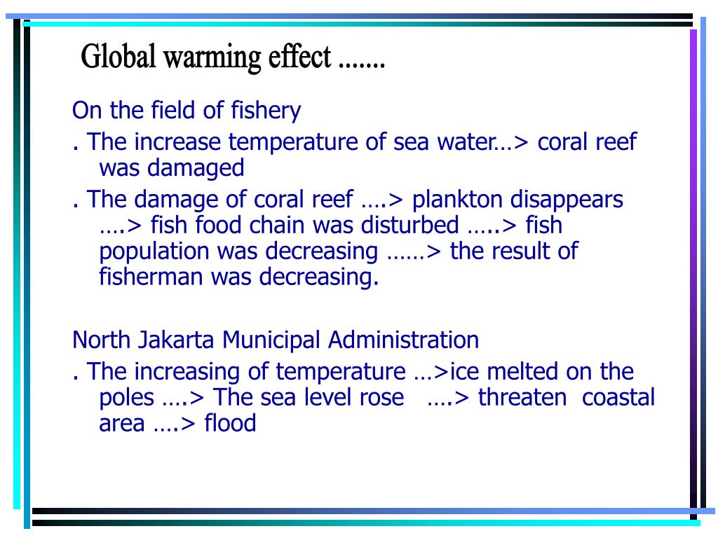 Global warming effect ....... On the field of fishery . The increase temperature of sea water…> coral reef was damaged . The damage of coral reef ….> plankton disappears ….> fish food chain was disturbed …..> fish population was decreasing ……> the result of fisherman was decreasing. North Jakarta Municipal Administration . The increasing of temperature …>ice melted on the poles ….> The sea level rose ….> threaten coastal area ….> flood