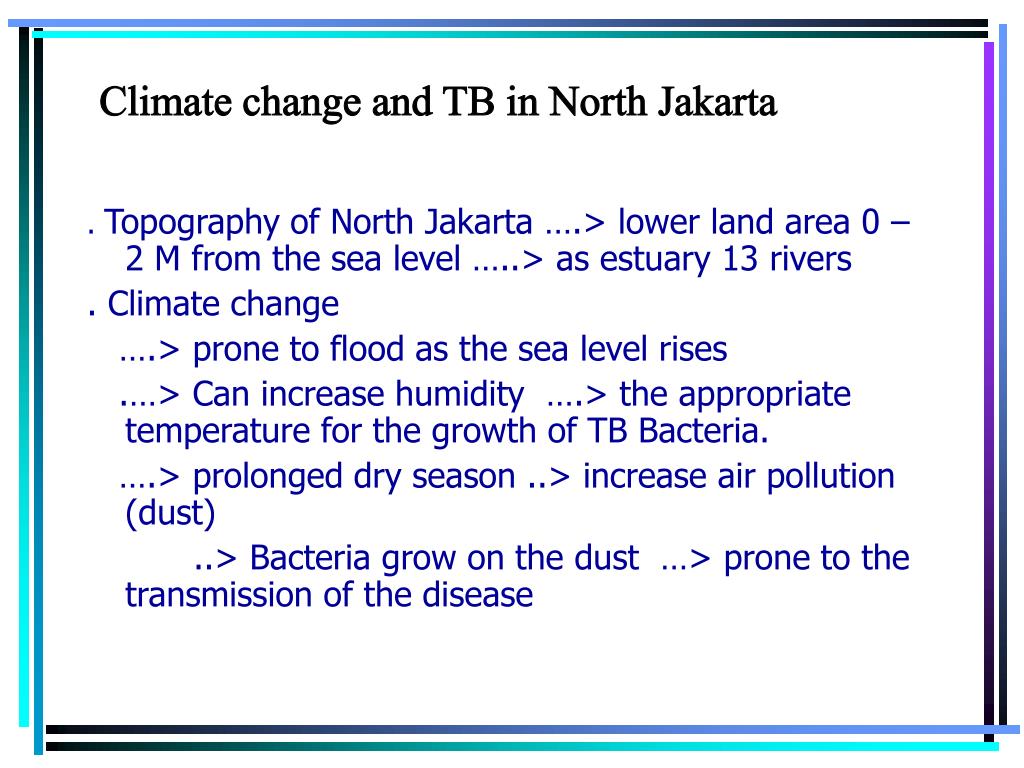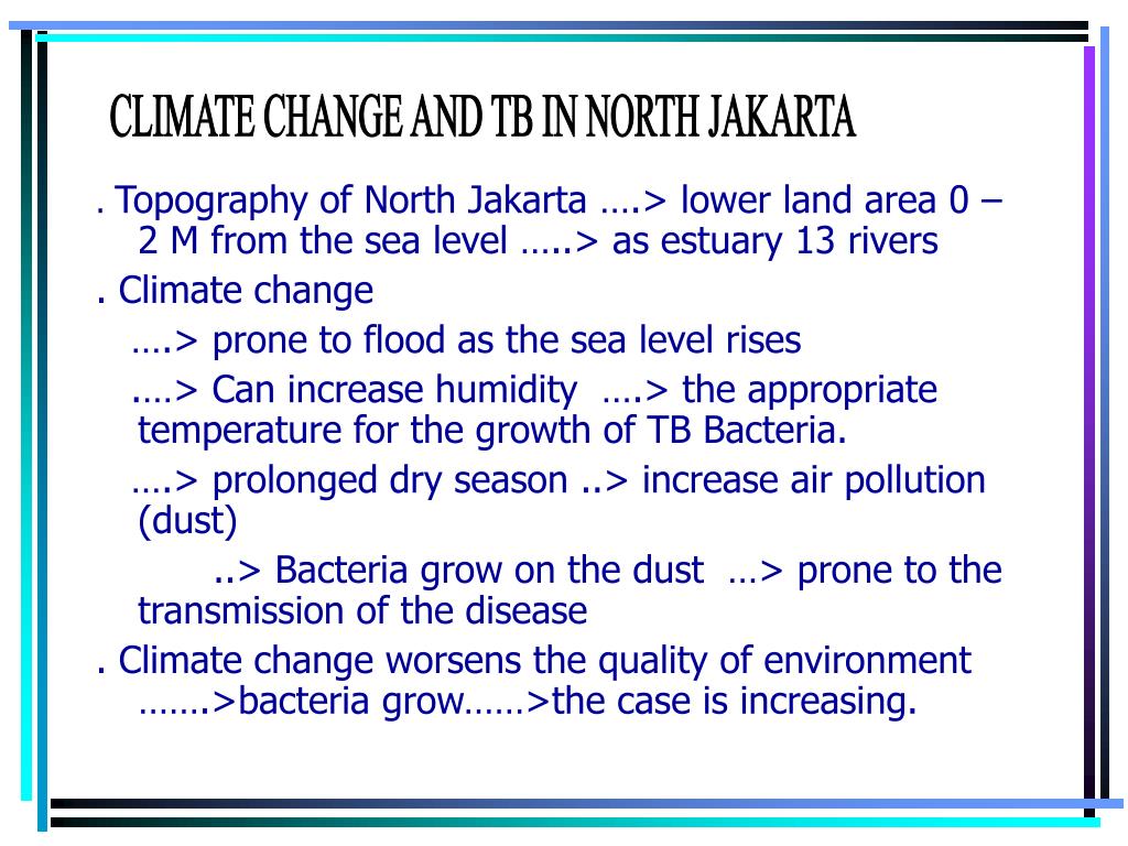 CLIMATE CHANGE AND TB IN NORTH JAKARTA . Topography of North Jakarta ….> lower land area 0 – 2 M from the sea level …..> as estuary 13 rivers . Climate change ….> prone to flood as the sea level rises .…> Can increase humidity ….> the appropriate temperature for the growth of TB Bacteria. ….> prolonged dry season ..> increase air pollution (dust) ..> Bacteria grow on the dust …> prone to the transmission of the disease . Climate change worsens the quality of environment …….>bacteria grow……>the case is increasing.