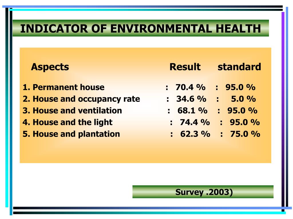 INDICATOR OF ENVIRONMENTAL HEALTH Aspects Result standard 1. Permanent house : 70.4 % : 95.0 % 2. House and occupancy rate : 34.6 % : 5.0 % 3. House and ventilation : 68.1 % : 95.0 % 4. House and the light : 74.4 % : 95.0 % 5. House and plantation : 62.3 % : 75.0 % Survey .2003)